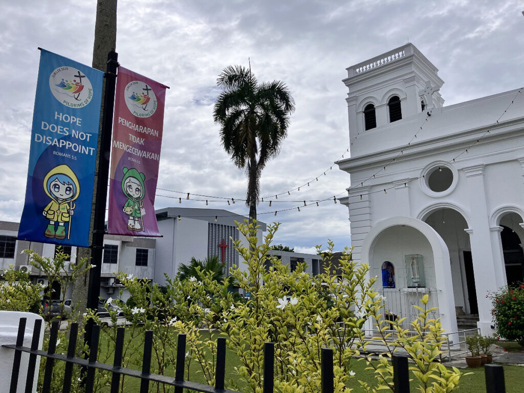 Des banderoles aux couleurs du Jubilé 2025 sur les pèlerins d’espérance devant l’église de l’Assomption à Georgetown, Penang. La mascotte du jubilé, « Luce », est très appréciée et reproduite dans de nombreux pays d’Asie.
