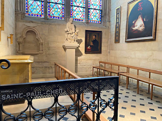 Dans ce grand ensemble, Paul Chen n’a non seulement pas été écarté mais se retrouve en finale de l’allée de la Pentecôte, en face de Noé, comme accomplissement des récits bibliques sur Noé : fidélité, universalité du salut, etc. Ce positionnement permet de terminer le parcours dans la cathédrale par un « envoi », celui vers la mission, dernier fruit de la Pentecôte, l’universalité de l’Église de par le monde mais aussi au cœur de Notre-Dame, dans un esprit d’unité, de fraternité et de solidarité du genre humain. La Promesse tient toujours et l’histoire sainte se poursuit à travers le monde. Dans la chapelle de la Sainte-Enfance désormais rebaptisée Saint-Paul-Chen, l’Esprit d’unité reçoit sa visibilité dans les traits sinisés de Marie et de son Fils et la présence d’un martyr chinois, qui a bénéficié de la solidarité des enfants français. Les liens entre Paul Chen et Paris s’expriment par les MEP et la Sainte-Enfance. Dans la nouvelle chapelle, le duilian est désormais associé à la toile de Marie, placée sur le mur occidental, et la sculpture de Geoffroy-Dechaume est placée au fond, sur le mur sud. Le reliquaire, contenant l’ensemble des ossements du corps du jeune martyr, est installé dans la chapelle Saint-Paul-Chen à l’automne 2025, accompagné de légendes multilingues, dont le chinois, pour permettre aux pèlerins et aux visiteurs de mieux comprendre la merveilleuse histoire de cet enfant du fin fond de la Chine, aujourd’hui honoré à Notre-Dame de Paris, à la suite des grands saints parisiens.