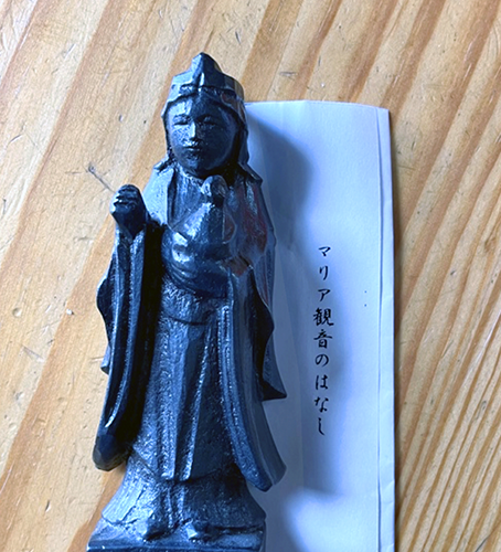 Cette statue représente une Vierge Marie à l’enfant camouflée sous les traits de la déesse bouddhique de la compassion : Kannon. Cette statuette est un héritage de la dévotion des « chrétiens cachés du Japon » qui devaient dissimuler leur foi à cause des persécutions entre 1613 et 1873.